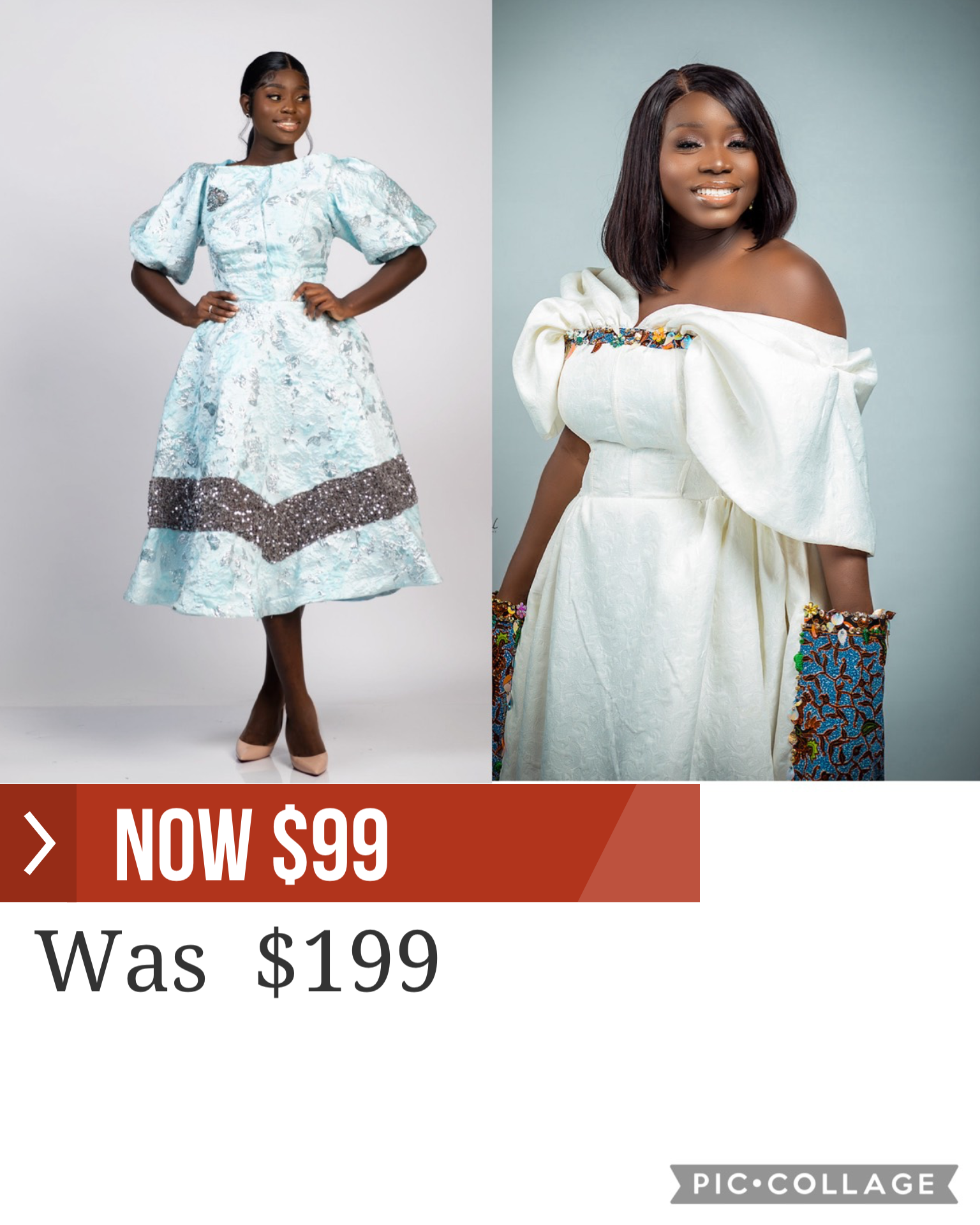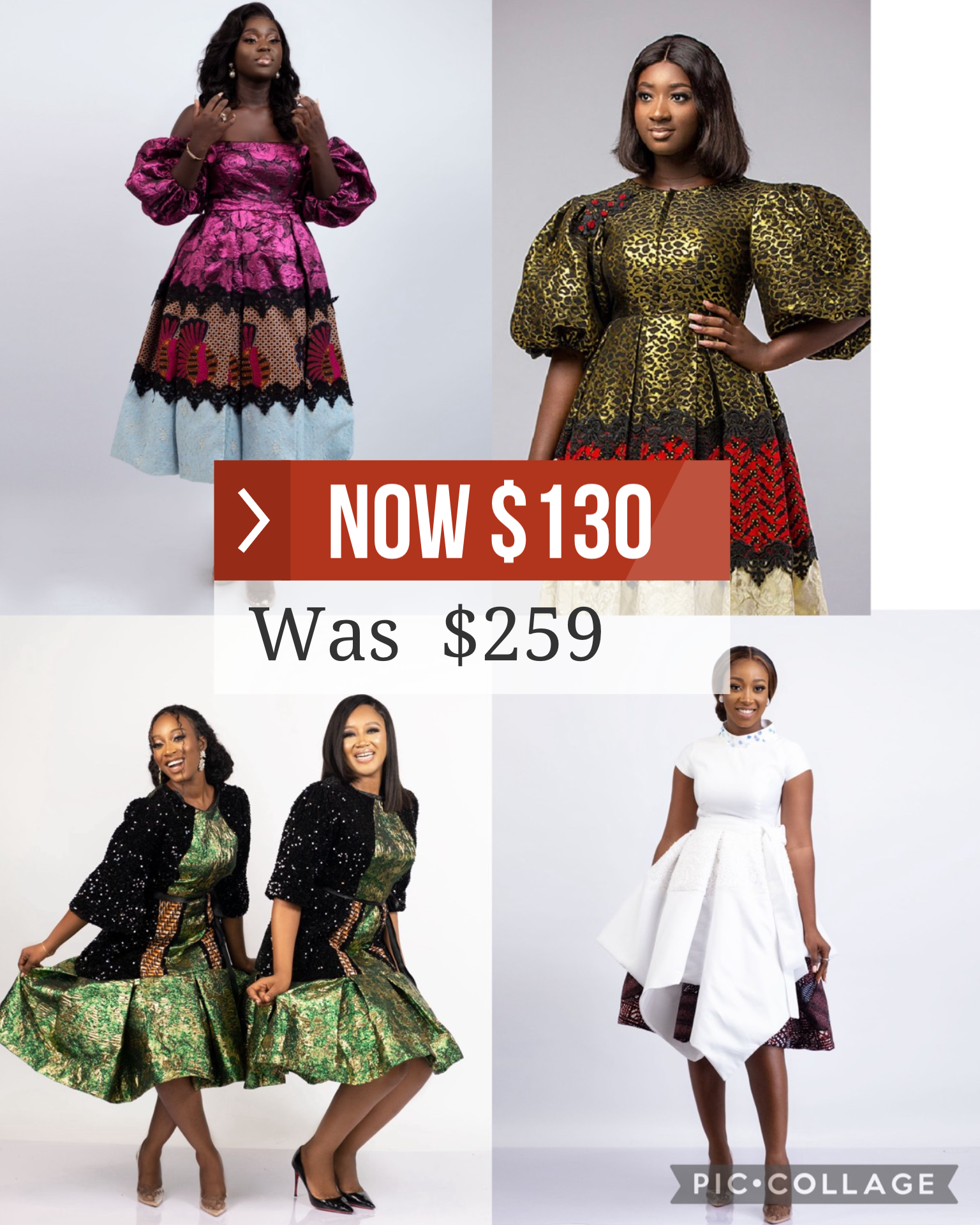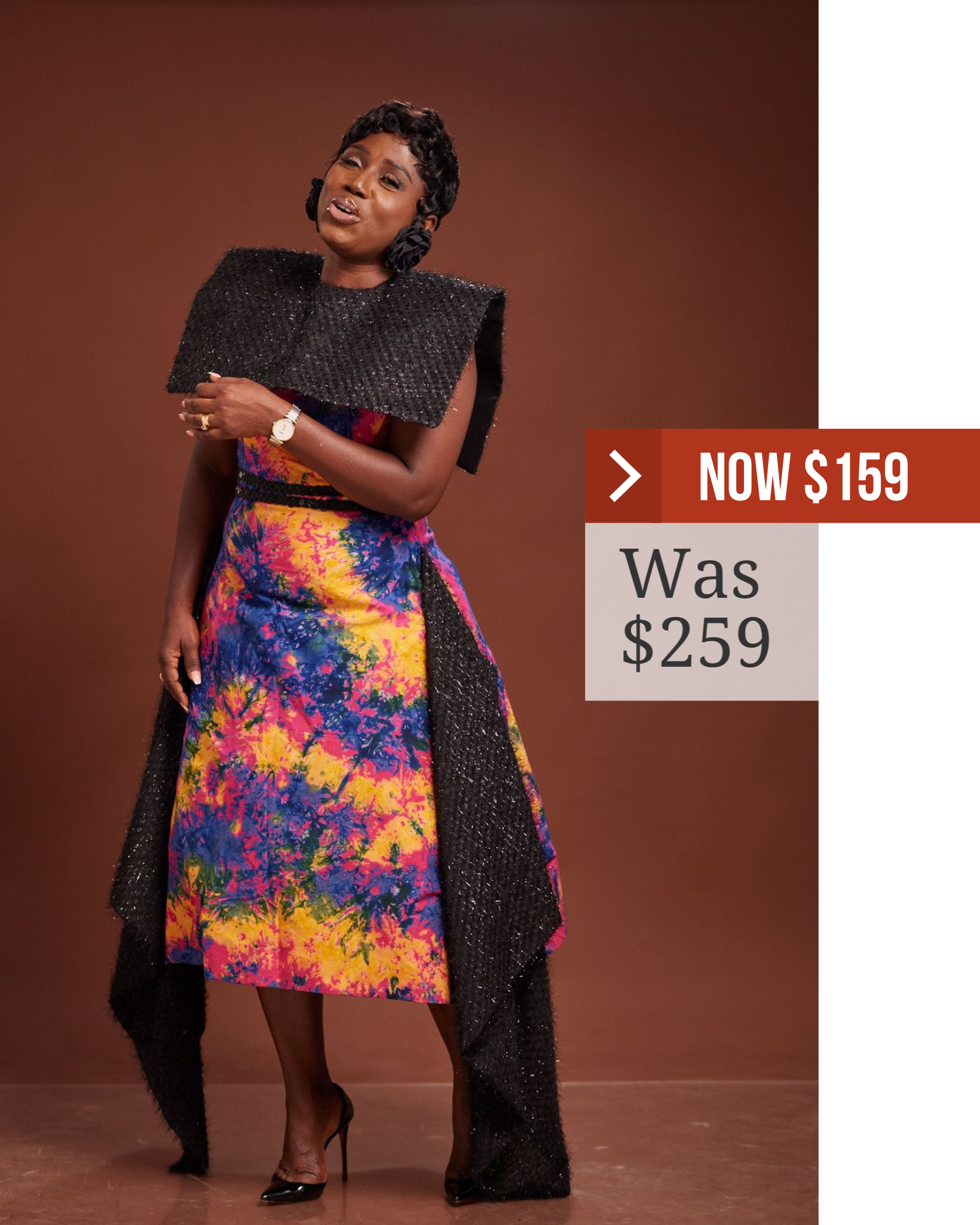 The Nakia Two Piece is your next statement pick, thanks to its bold and powerfully feminine construction. Crafted with a sleek black taffeta bodice, it’s elevated by a sculptural fur fabric element that frames the shoulders like wearable architecture. The body-hugging silhouette cinches the waist and flows into a tailored skirt, finished with a vibrant wax print panel that commands attention.
