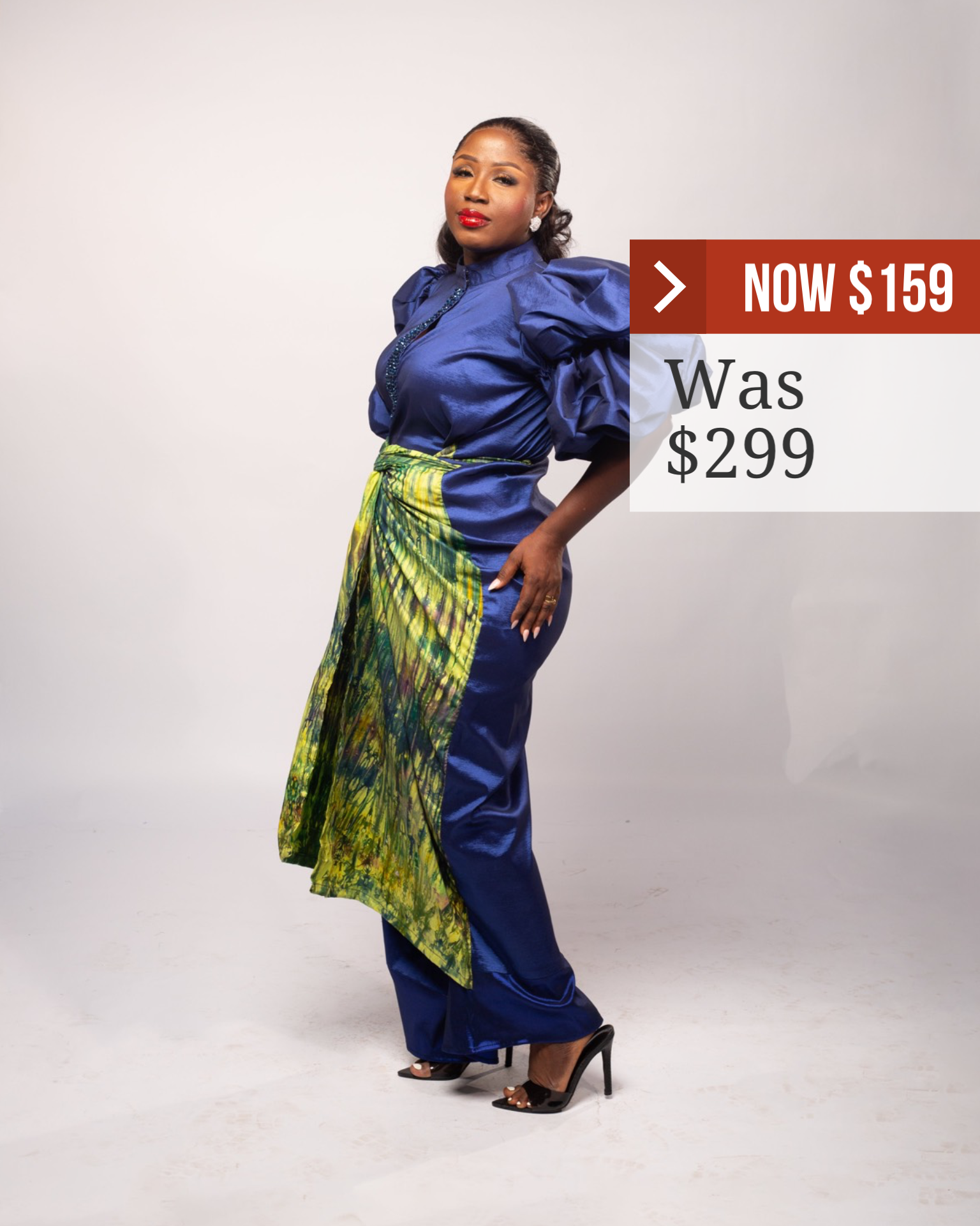 Say hello to statement dressing with the Yihana Two Piece. Crafted from micropleated metallic brocade, this head-turning matching set is all about silhouette and shine. The exaggerated pants feature a sculptural curved cut that catches the light from every angle, while a wax print waistband adds a surprising pop of texture and tradition. The look is topped with voluminous organza ruffles in vibrant jewel tones, blooming from a structured taffeta base.