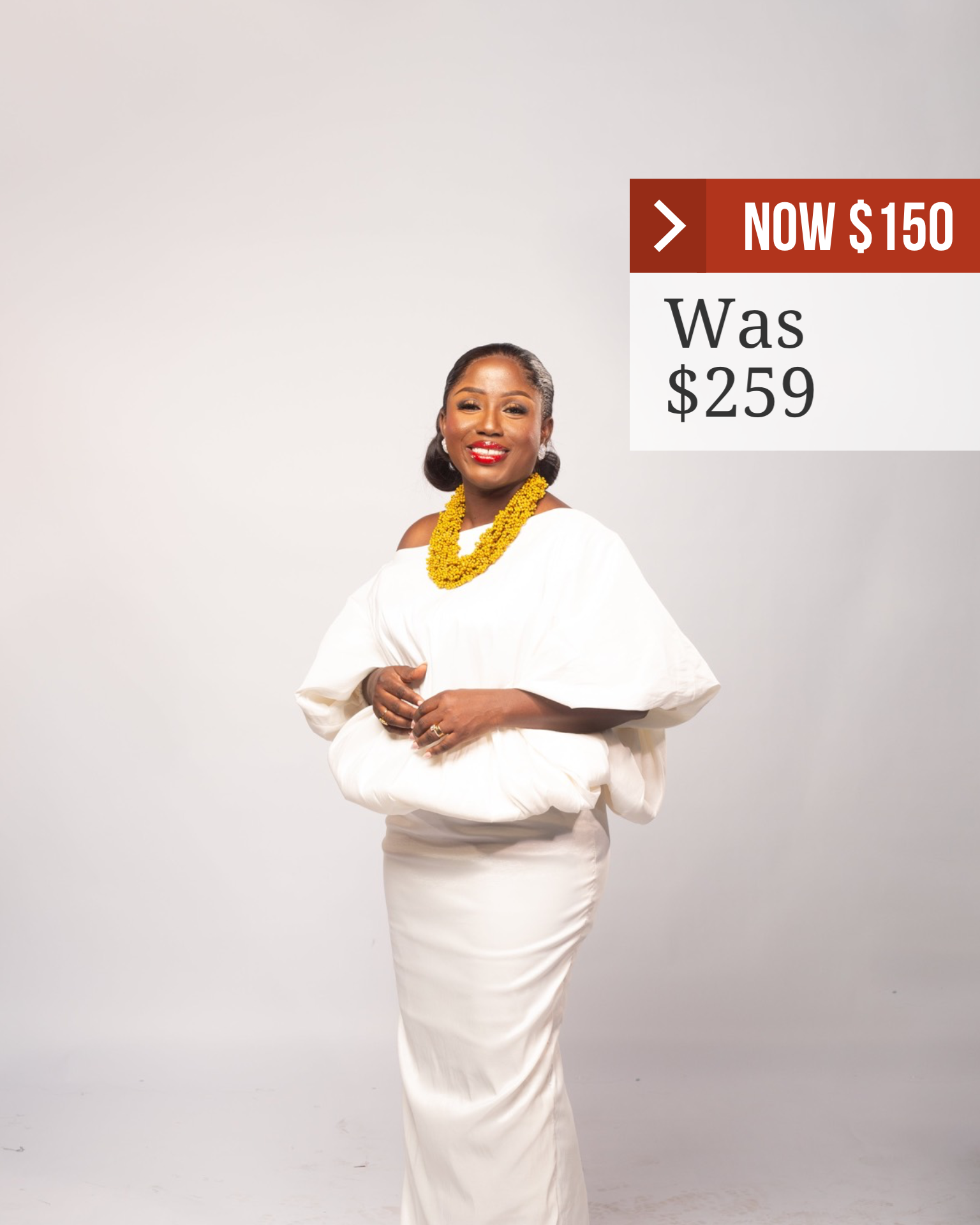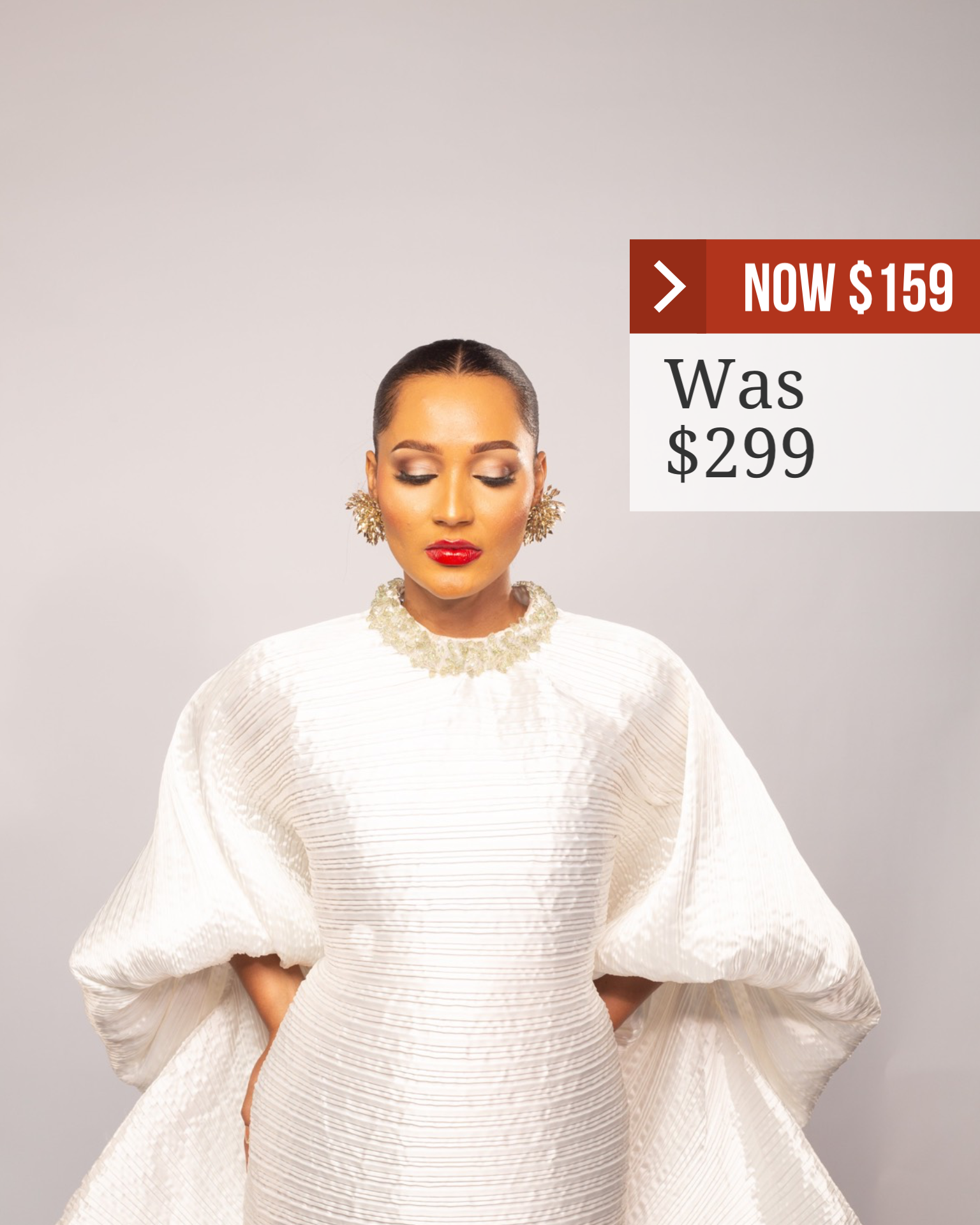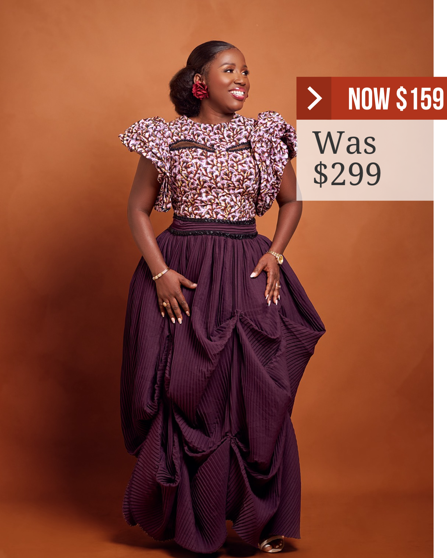 The Shuri Two Piece is your golden ticket to modern glamour, completed with a touch of heritage flair. Crafted from pleated metallic satin, the tiered skirt shimmers with every step, offering dramatic volume and fluid movement. The structured off-shoulder top wraps elegantly around the bodice, while a bold wax print corset cinches the waist, creating a captivating contrast that celebrates feminine strength and artistry.