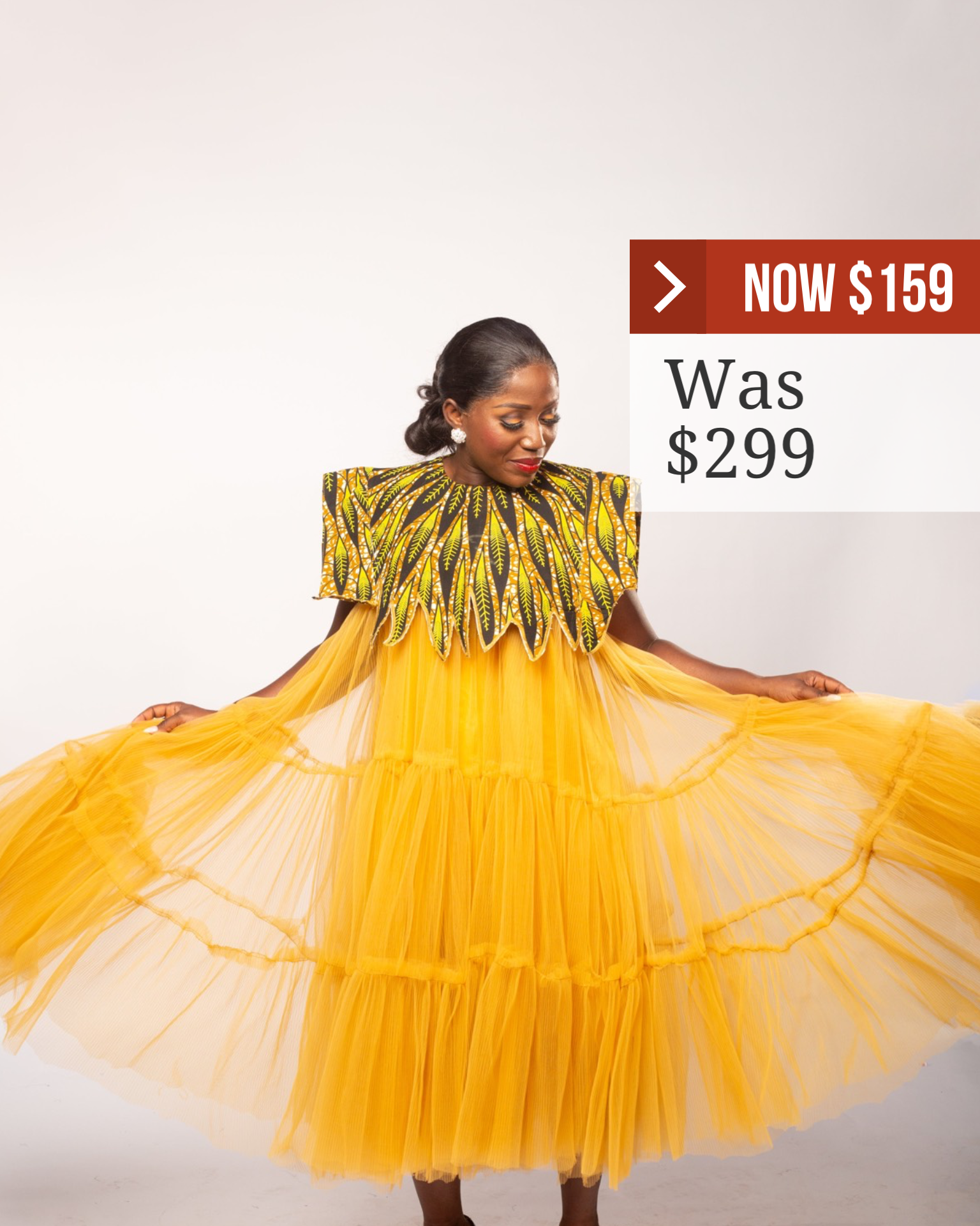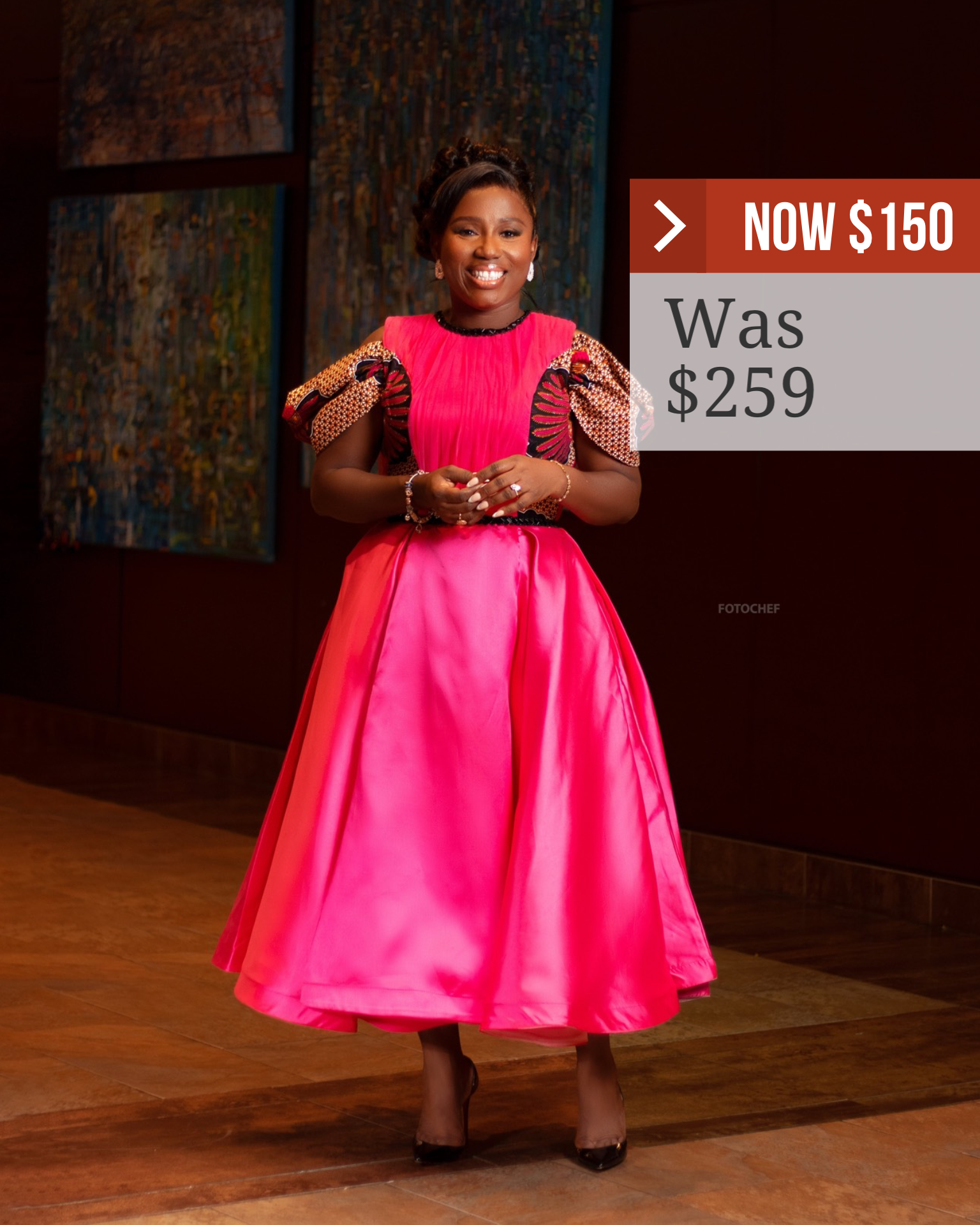 Get ready to turn heads in the show-stopping Mayan Dress, a statement piece designed for the bold and unapologetically stylish. This striking pink colored midi dress is crafted from luxe lace and features shimmering accents that catch the light with every move. The curve-skimming bodice flows effortlessly into a voluminous peplum hem, finished with layers of soft tulle peeking out for that extra drama. The wax print collar is rich in texture and boldly embellished — instantly elevates the look with a dose of cultural edge and high-fashion flair.